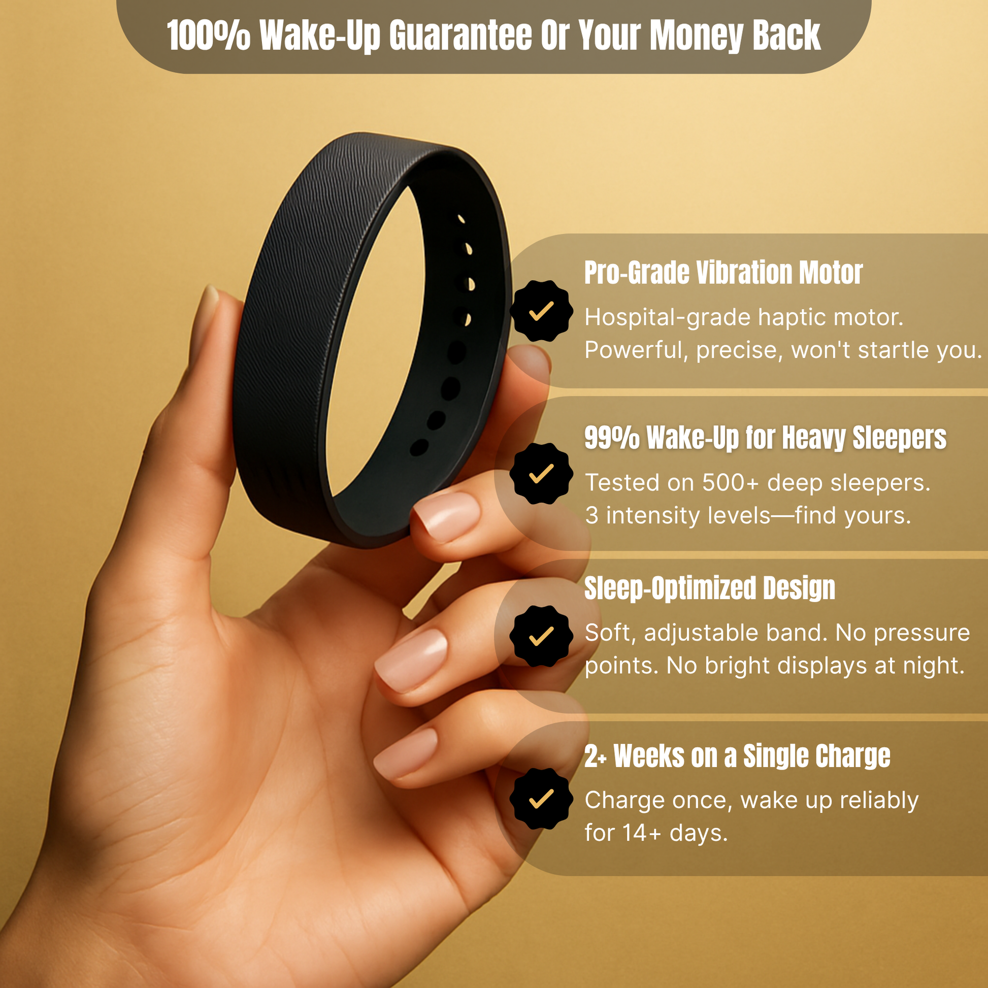 HushRise WakeUp Elite wakes you with silent haptics on your wrist, never with noise in the room.