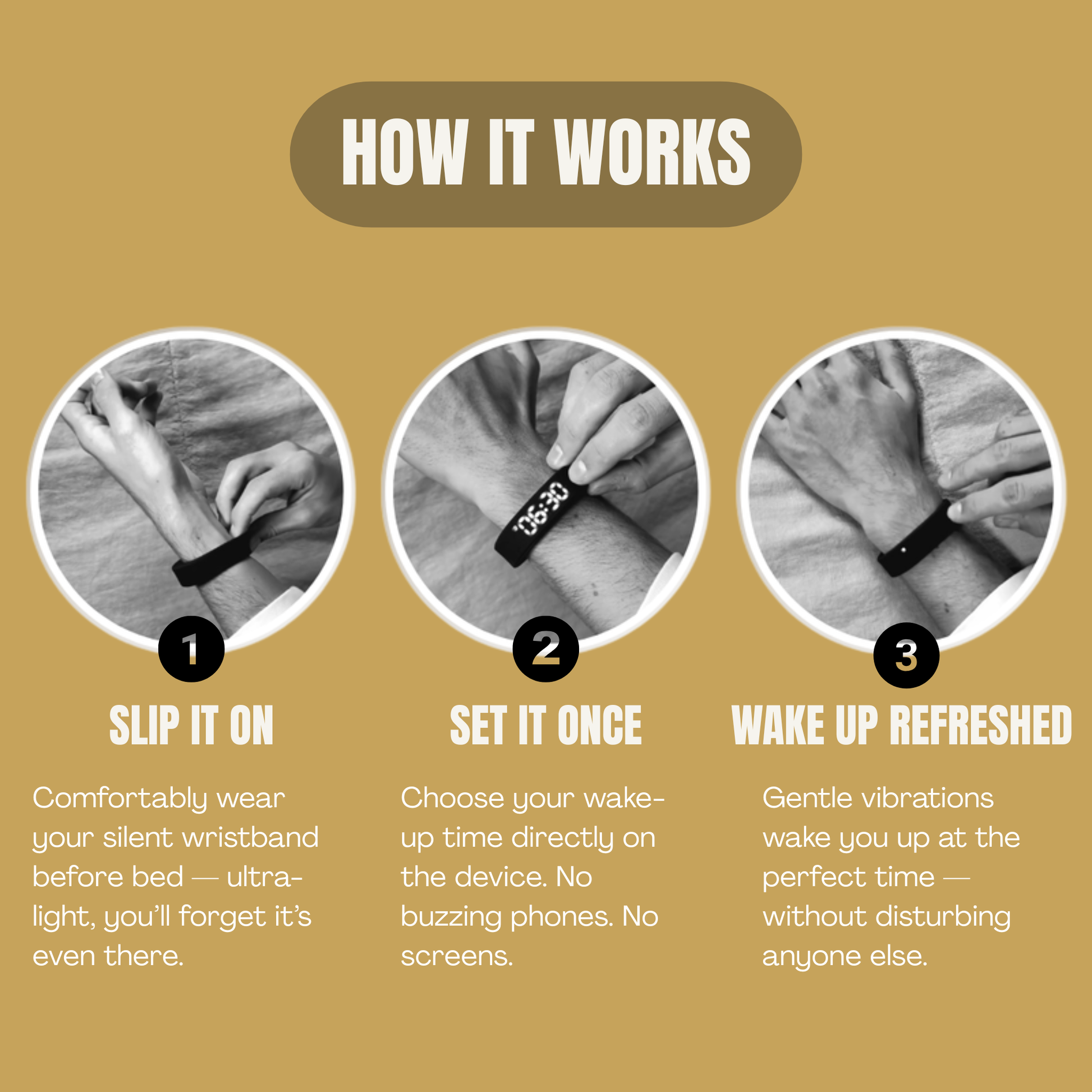 The world's first dedicated silent alarm bracelet built for one job: waking you up without waking anyone else.